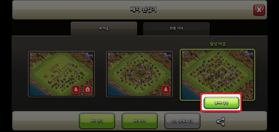 - 클래시 오브 클랜을 실행해서 자신의 배치를 복사하고 자신의 배치를 다시 적용해보는 과정을 통해 배치를 복사하는 방법을 알아봅시다.