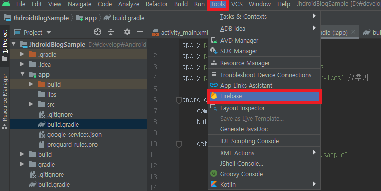 - 안드로이드 상단 메뉴 - Tools - Firebase 선택